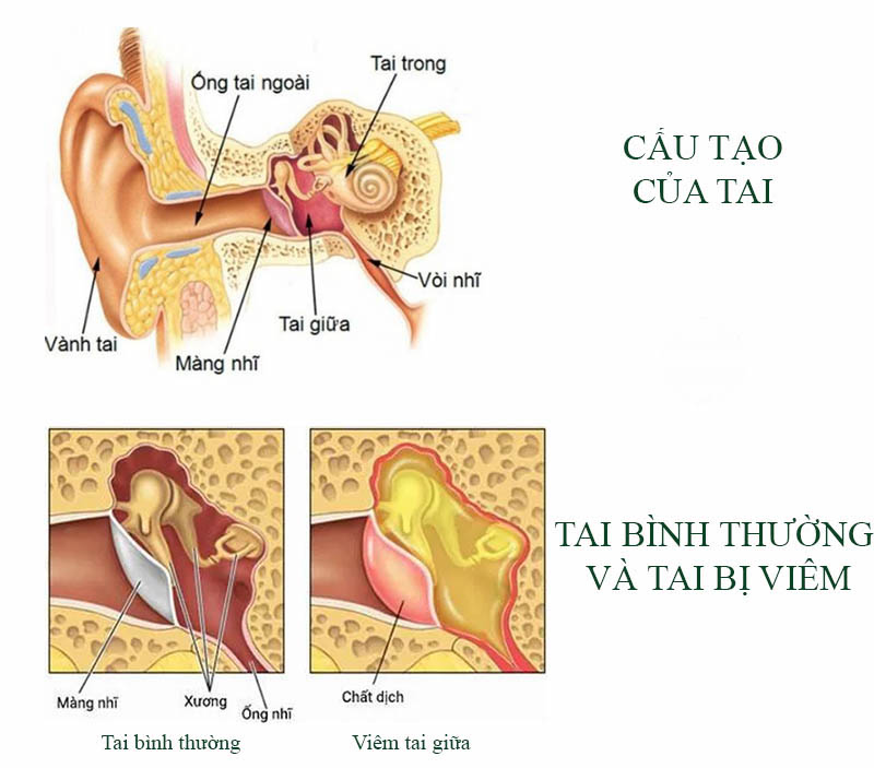 - Viêm tai giữa cấp tính: xảy ra khi nhiễm trùng tai giữa xảy ra đột ngột, gây phản ứng viêm là sưng, nóng và đỏ, đau tai kèm sốt cao. Dịch và mủ sẽ kẹt trong màng nhĩ nên còn gọi là viêm tai giữa có mủ ở người lớn.