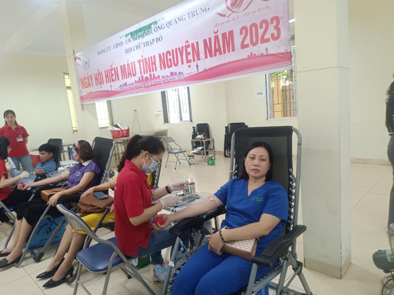 Hiến máu cứu người không phải là một hành động xa lạ đối với mỗi người, bởi đã có rất nhiều các chiến dịch hiến máu tình nguyện được tổ chức thường niên nhằm kêu gọi người dân tham gia hiến máu. Tại phường Quang Trung để hưởng ứng phong trào này, hàng năm Ủy ban nhân dân- Ủy ban Mặt trận Tổ quốc đã phối hợp với Hội chữ thập đỏ tổ chức “Ngày hội Hiến máu tình nguyện “ chương trình đã thu hút được nhiều tình nguyện viên là các cán bộ, công chức viên chức, chiến sĩ các lực lượng vũ trang, trên địa bàn phường tham gia, đặc biệt là các cán bộ ngành y tế phường vừa là người chăm sóc sức khỏe cho cộng đồng và cũng là những tình nguyện viên luôn sẵn sàng tham gia các đợt Hiến máu do các tổ chức kêu gọi.